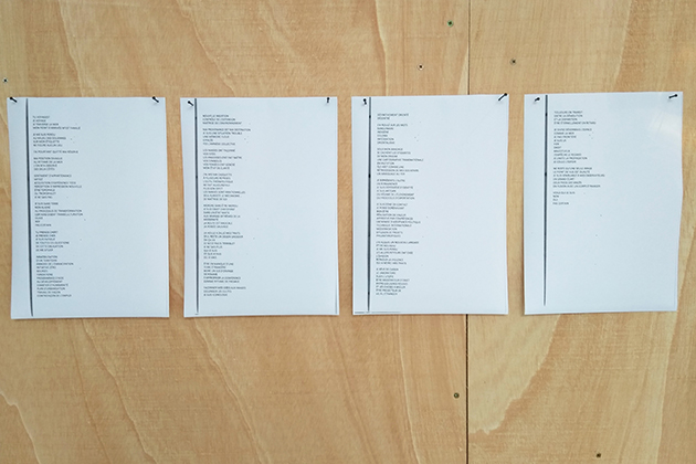 350 x 40 x 220 cm, bois, café froid, cigarette, chewing-gum, plante artificielle, post-it, encapsulage, menthe, texte sur papier A4 d’imprimante, édition à reliure à la japonaise