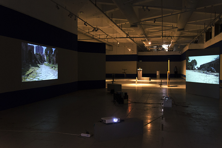 Projection sur trois écrans et installation avec matériaux collectés à l’ancienne gare Kafr Ashry et en ville : vis rouillées, débris de mur, corail séché, plante séchée, morceau de raisin donné par un peintre égyptien, palette industrielle, carton en tube, objet inconnu brûlé