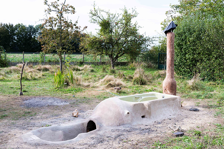 Torchis avec argile ocre du jardin de chez Apolline Grivelet et Loren Chorley, chutes d’argile récupérées par Marion Richomme, pailles ramassées au bord des rues de Quesnel-Aubry, crottins de cheval donnés par les Écuries de la Brèche, vermiculite expansée (Vermex), ardoise, briques récupérées chez les voisins Arlette et Marcel, baignoire en fonte d’Apolline et Loren, chauffe-eau en inox d’occasion acheté au ferrailleur DELAHOCHE père et fils, couronne cuivre parvenue de Venelles pour l’échangeur thermique à serpentin, chaux NHL 3,5, chaux de Marrakech pour le tadelakt, sables (venant partiellement des débris de l’église du Quesnel-Aubry)