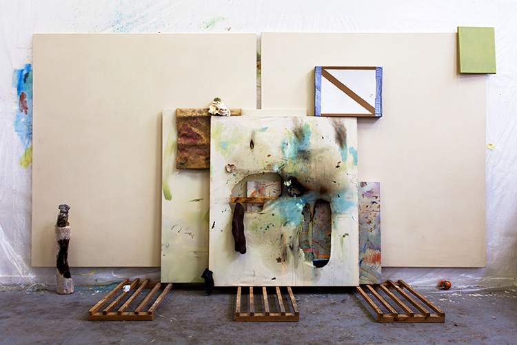 Pots de colle de peau de lapin, huile sur toile élastique brûlée, résidus de peinture collectés depuis 5 ans, marbres de carrare trouvés lors du voyage à vélo en 2013, pierres de bauxite de Sommières, matériaux collectés aux alentours de l’atelier : pneu coloré, morceaux de miroir peints et brisés, sac de jute, tuyau pvc, corde, oursin séché, bois industriel, carton, polystyrène, polyuréthane, métal rouillé, matelas