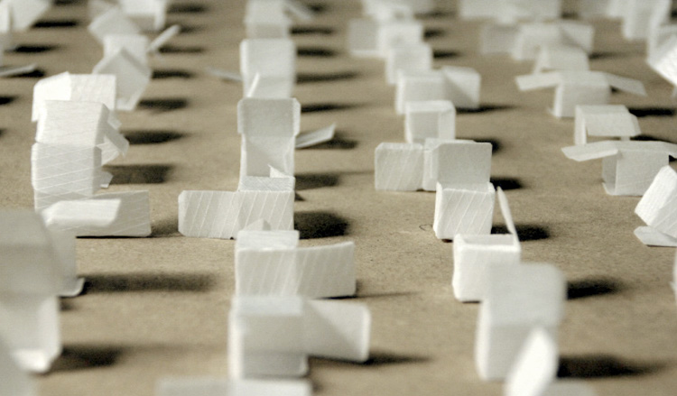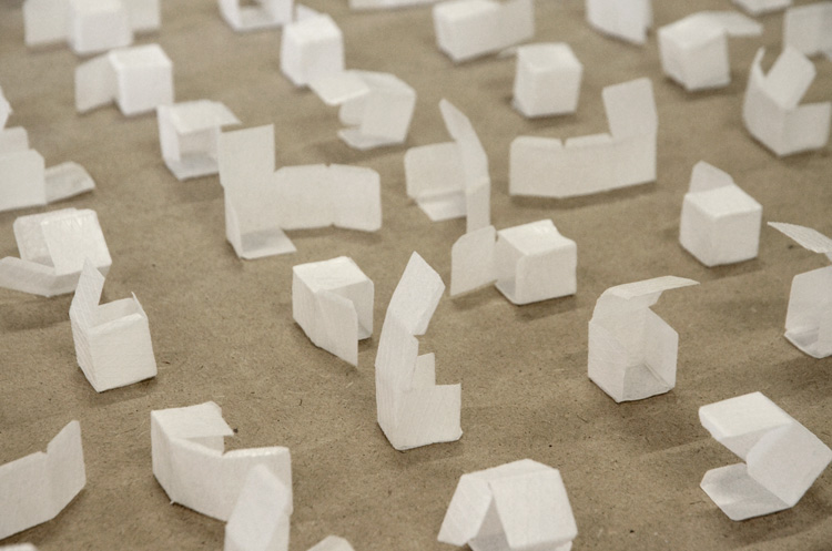 L’étrange sensation que les formes se multiplient… un désordre, une instabilité derrière un classement rigoureux. Le déploiement de ces petits cubes dans tous leurs états joue avec notre perception : la forme se répète, sans nulle répétition.