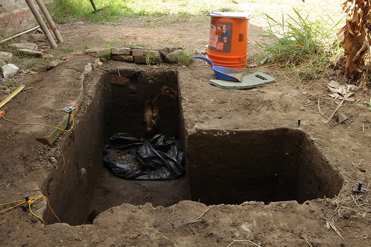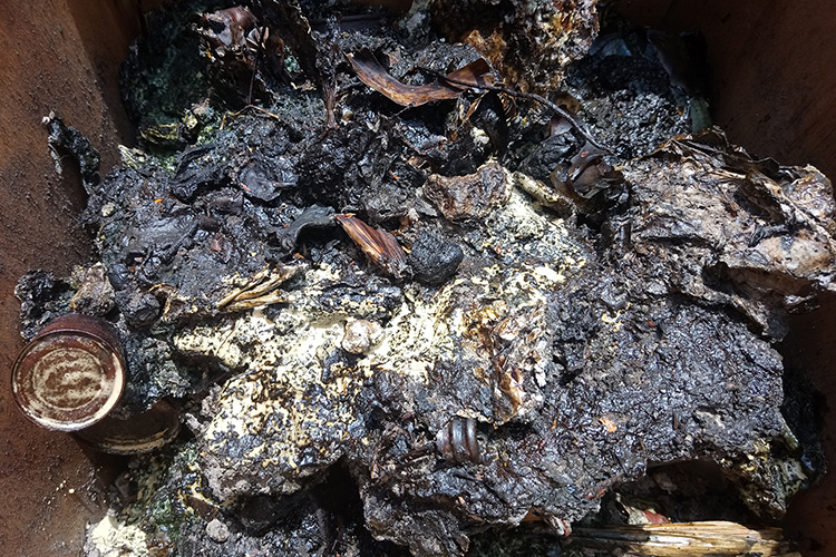 Installation évolutive, sédimentation et compostage de déchets collectés autour des bananeraies, excavation laissée par une équipe d’archéologues |