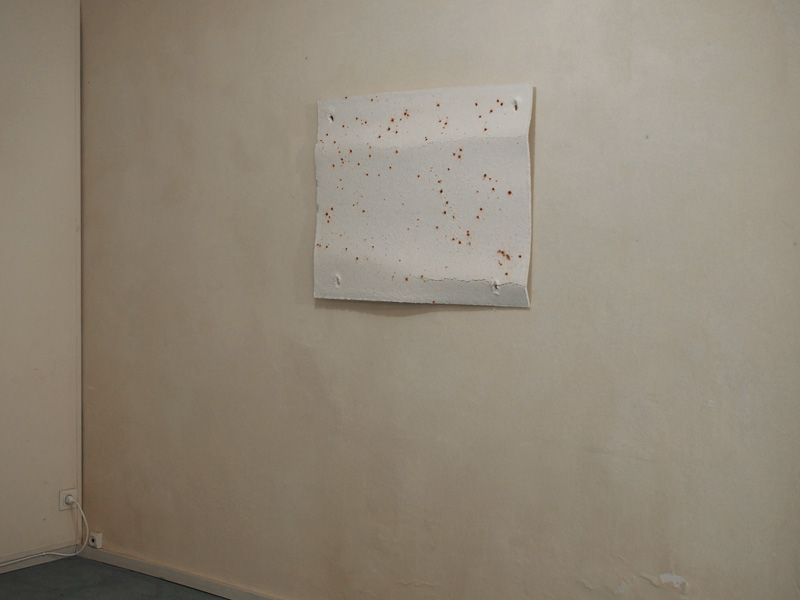 Plâtre, journaux broyés, pigment, clous, 81 x 68 cm