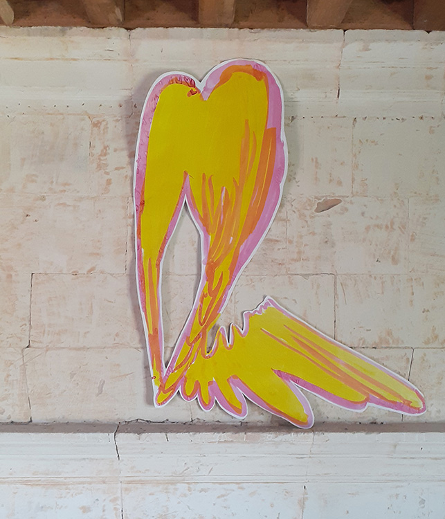 Pigeon 2023 Encre d'acrylique sur papier découpé, étincelle, env. 200 x 400 cm In situ à la fontaine aux Ateliers de Coussay Photo avec l'aimable autorisation de l'artiste